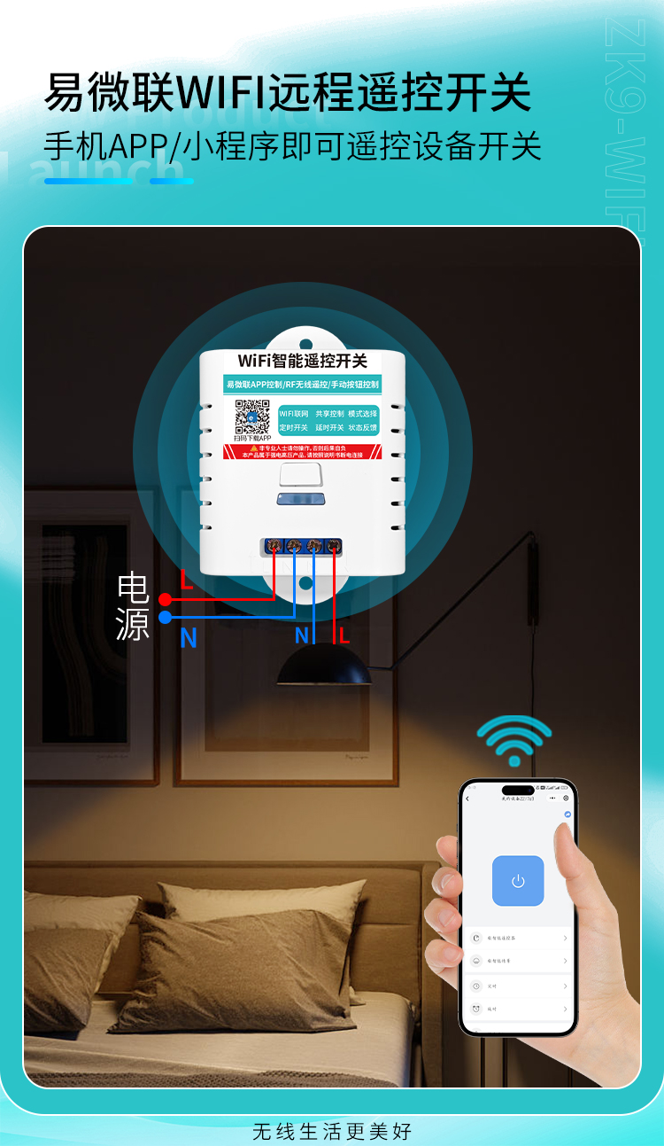 ZK9-WIFI是一款单路智能遥控开关,可使用手机遥控,电压输出