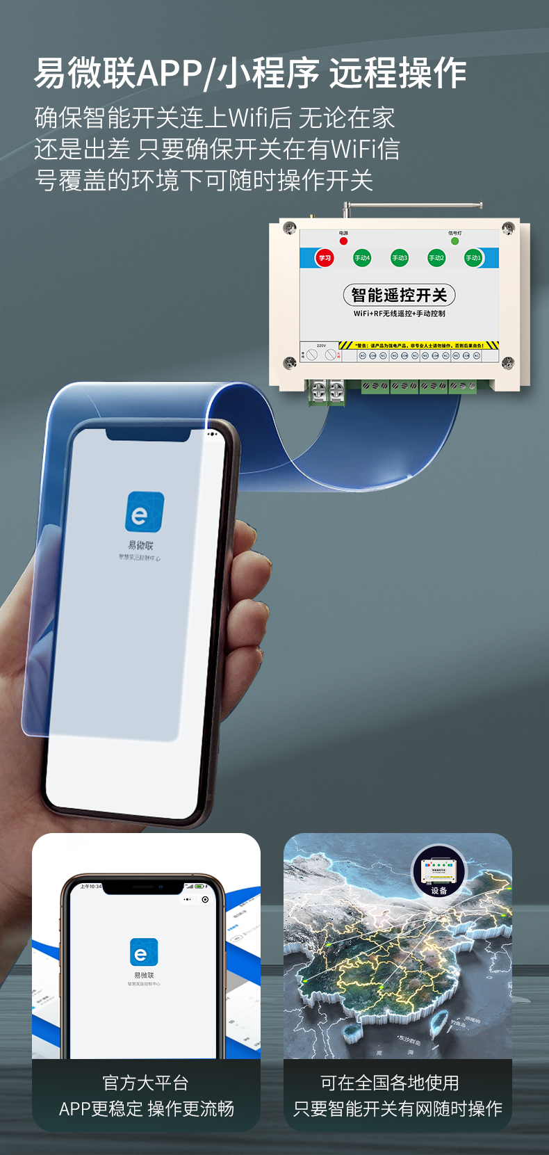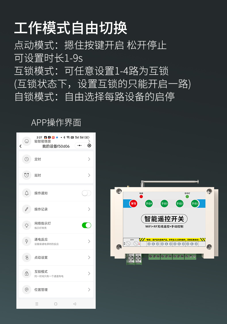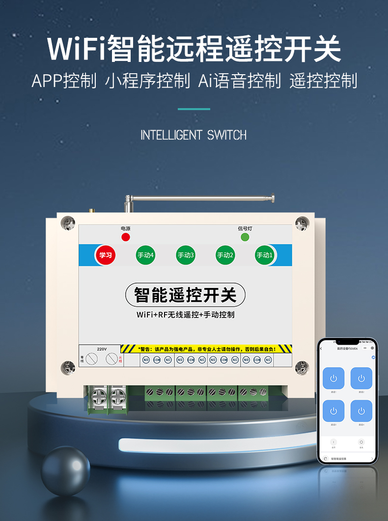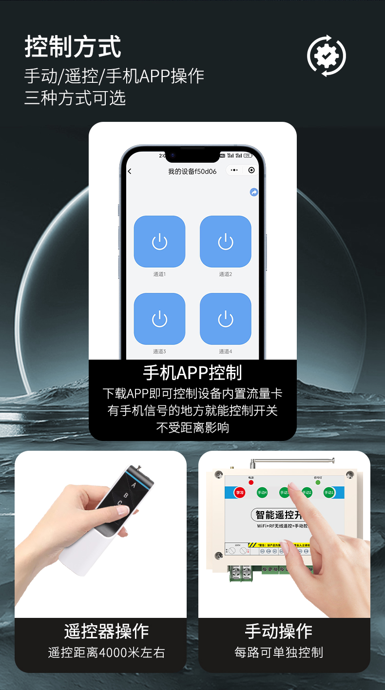 ZK4-WIFI是一款4路智能遥控开关,可使用手机进行远程遥控,不限距离。
