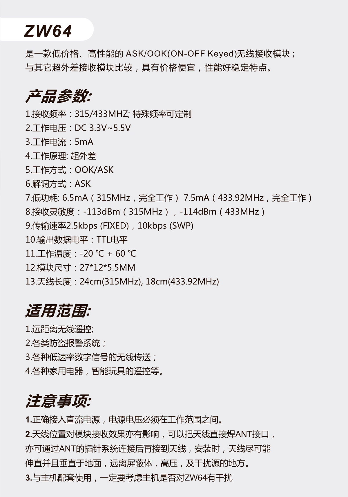 ZW64是一款低价格、高性能的ASK/OOK(ON-OFF Keyed)香妃直播软件下载接收模块,与其他超外差接收模块比较,具有价格便宜,性能好稳定特点。