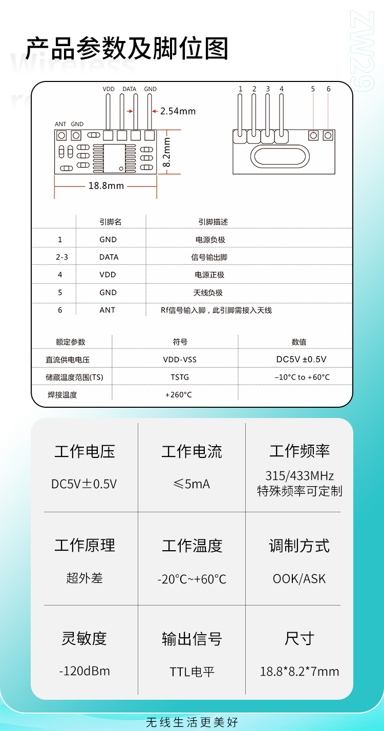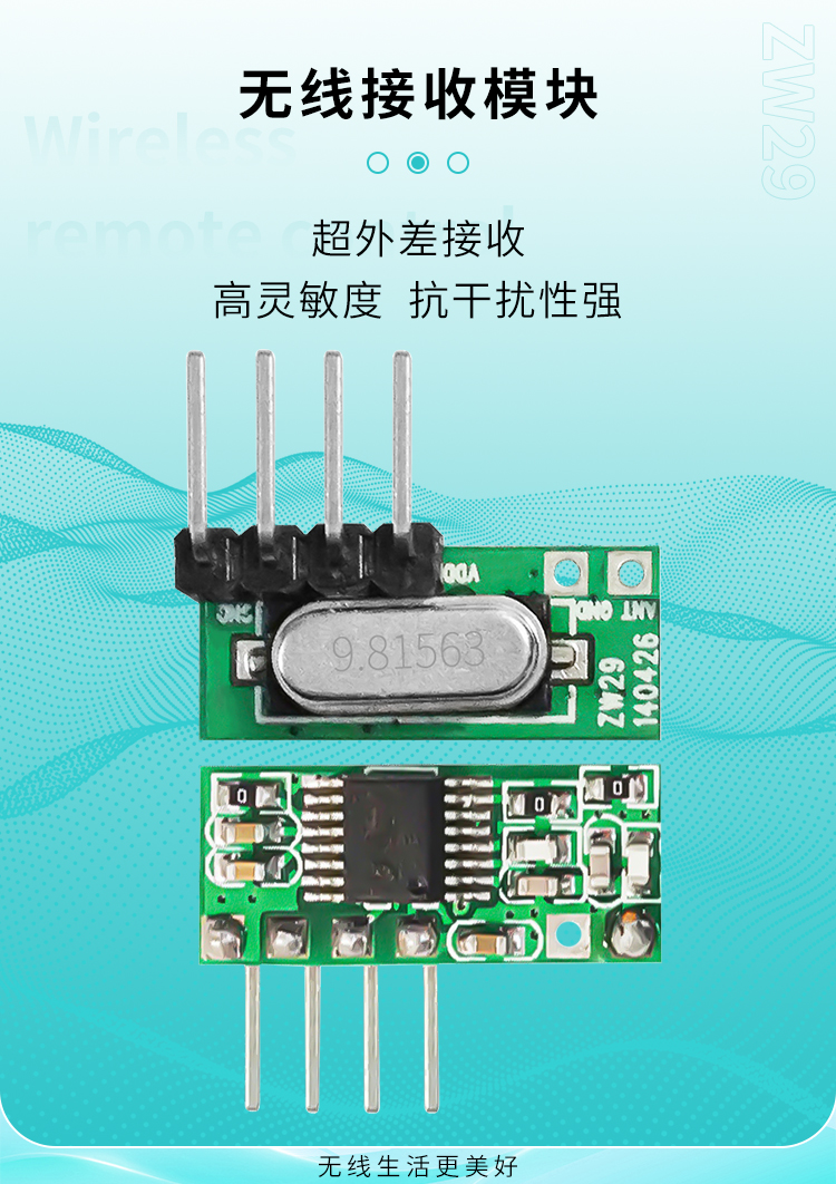 ZW29是一款低价格、高性能的ASK/OOK(ON-OFF Keyed)香妃直播软件下载接收模块,主要香妃视频APP下载安装于香妃直播软件下载遥控接收领域。与其他超外差接收模块比较,具有价格便宜,性能好稳定特点。灵敏度能达到-120dBm,大大增强了接收距离。