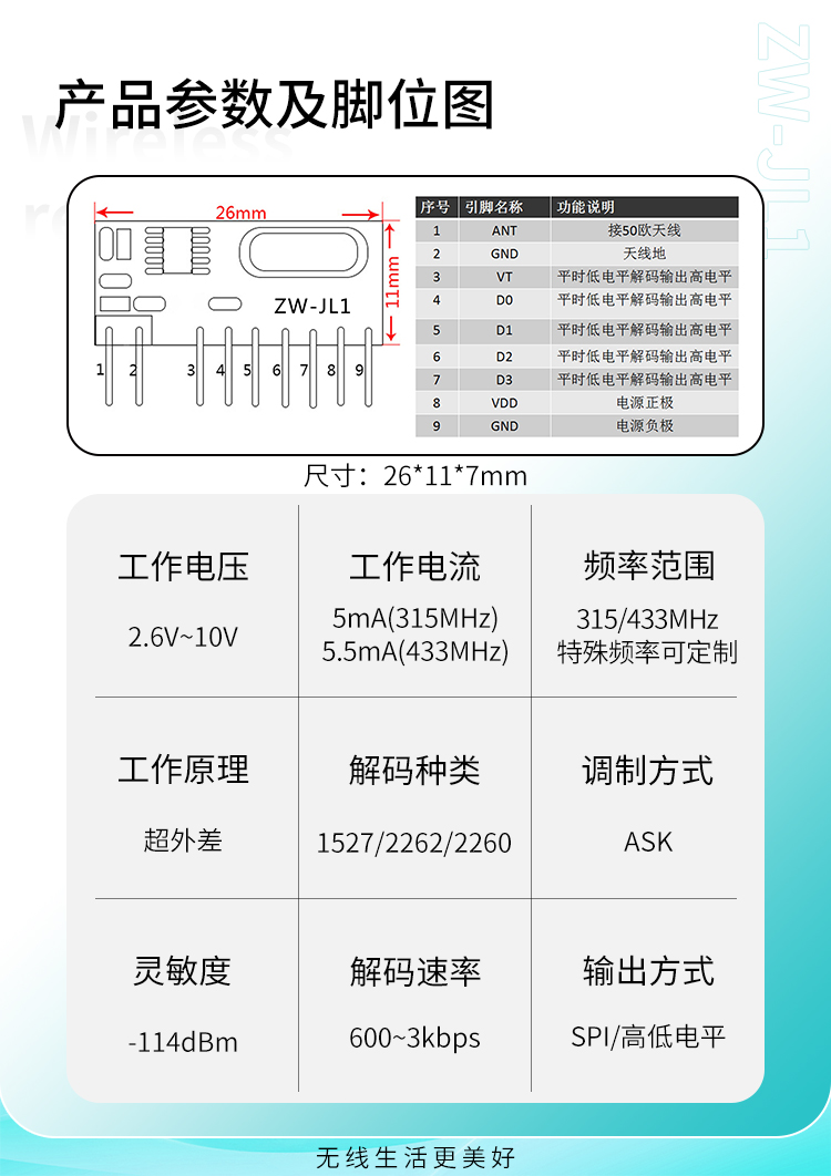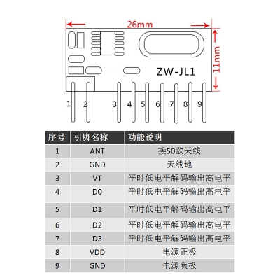 ZW-JL1是一款超外差带解码香妃直播软件下载接收模块,它具有高灵敏度、抗干扰性强、性价比高等特点