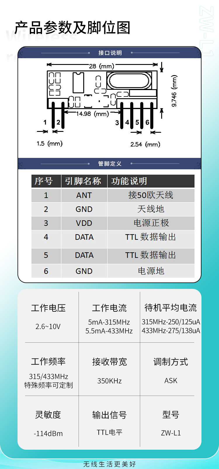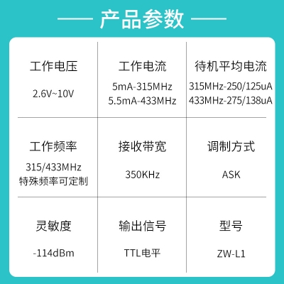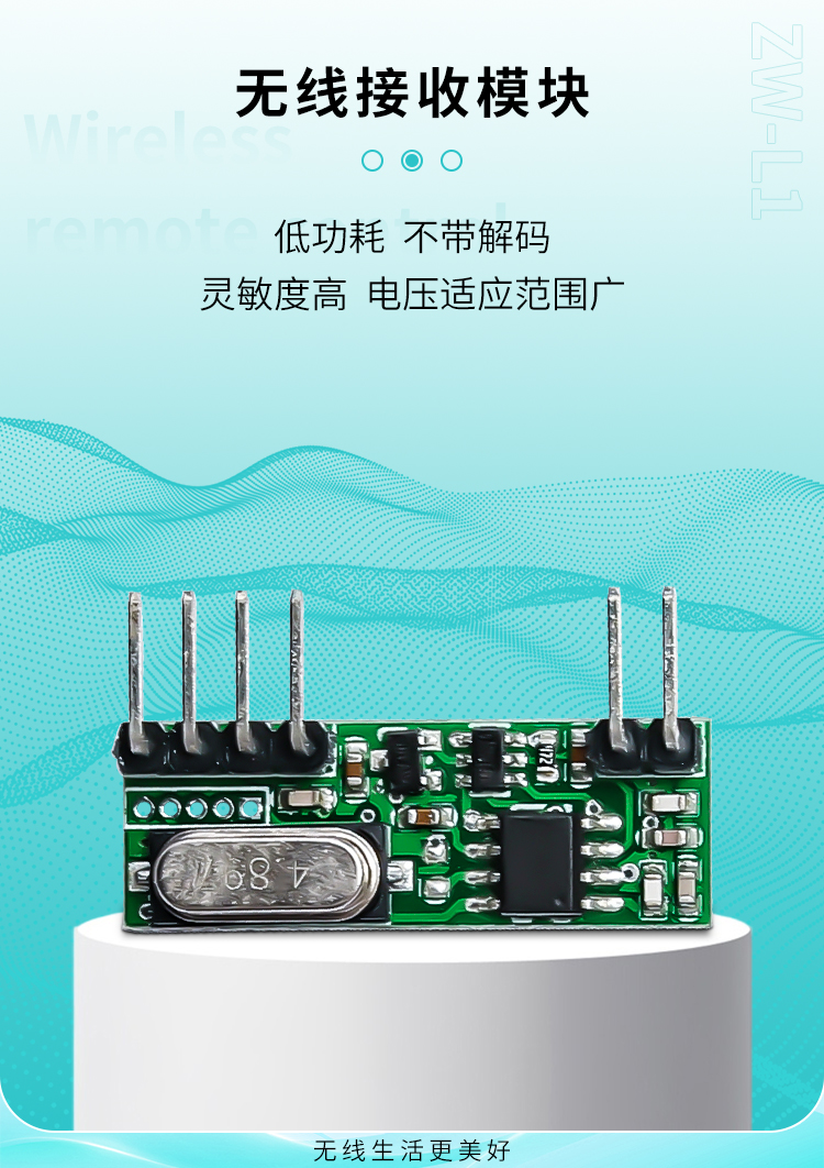 ZW-L1是一款高灵敏度、低功耗、不带解码的接收模块,它工作电压范围广