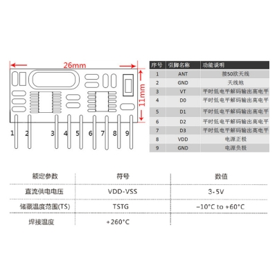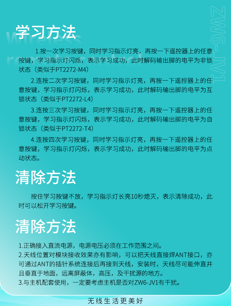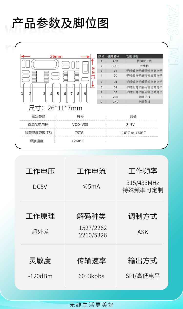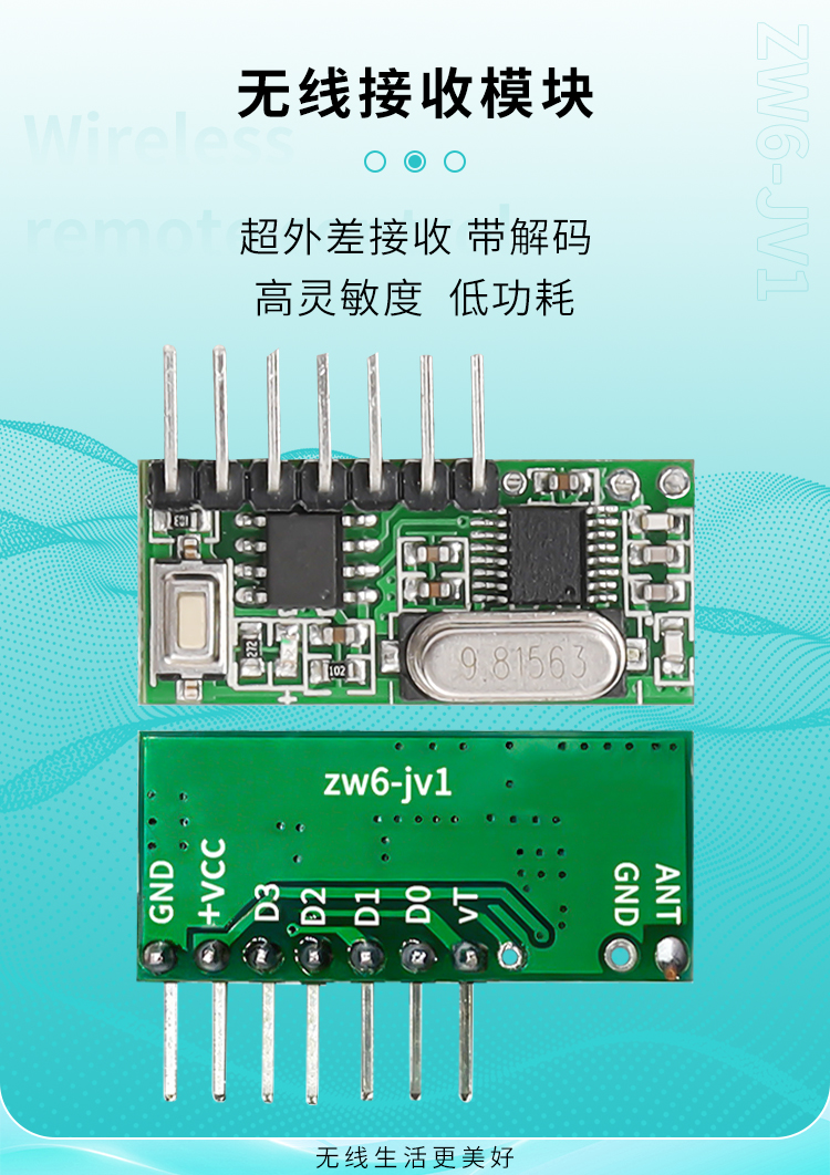 ZW6-JV1是一款超外差、带解码的接收模块,它具有高灵敏、低功耗、高性价比的优势。