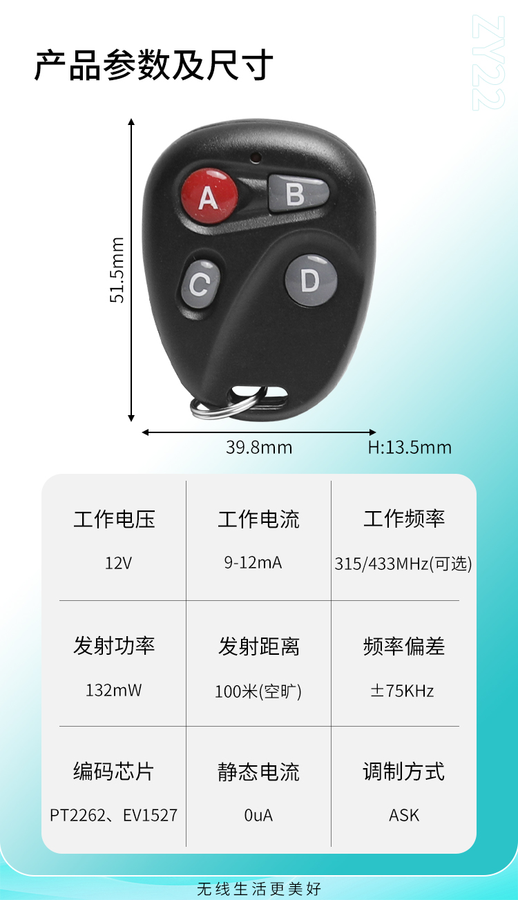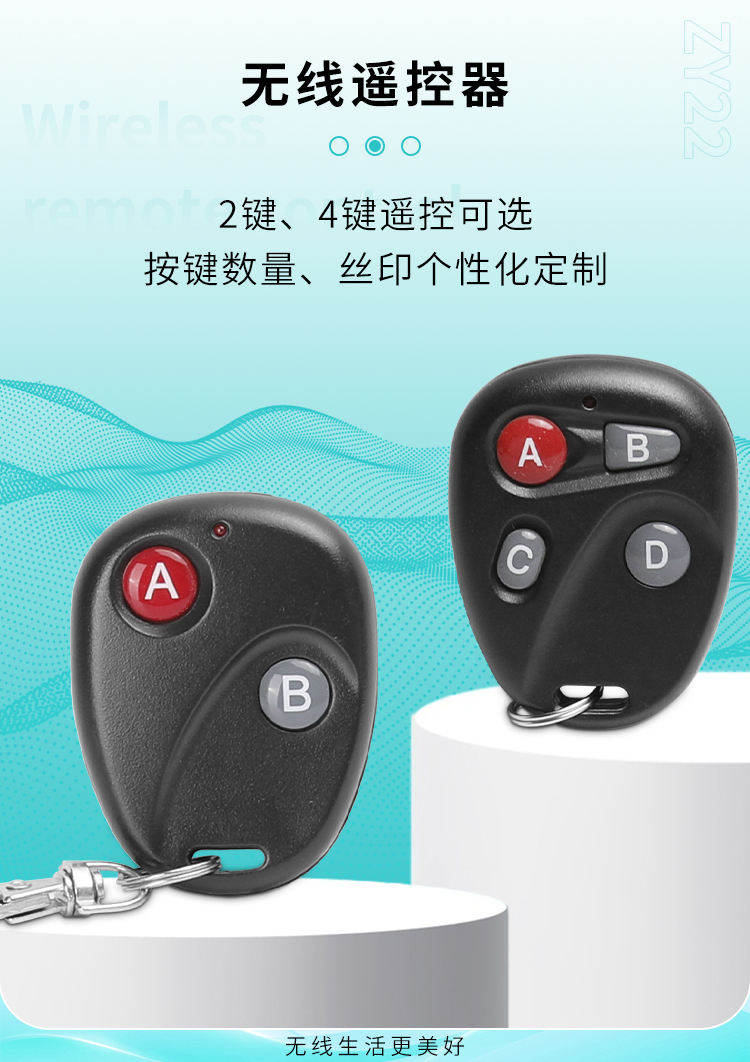 ZY22是一款小功率香妃直播软件下载遥控器,2键4键可选择,外观小巧精致