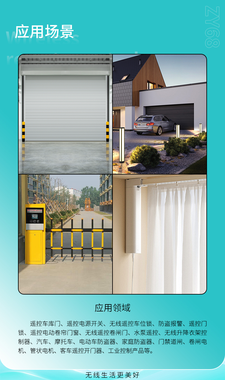 遥控开关、遥控车库门、防盗报警、遥控门锁、遥控电动卷帘门窗、水泵遥控、工业控制产品等;