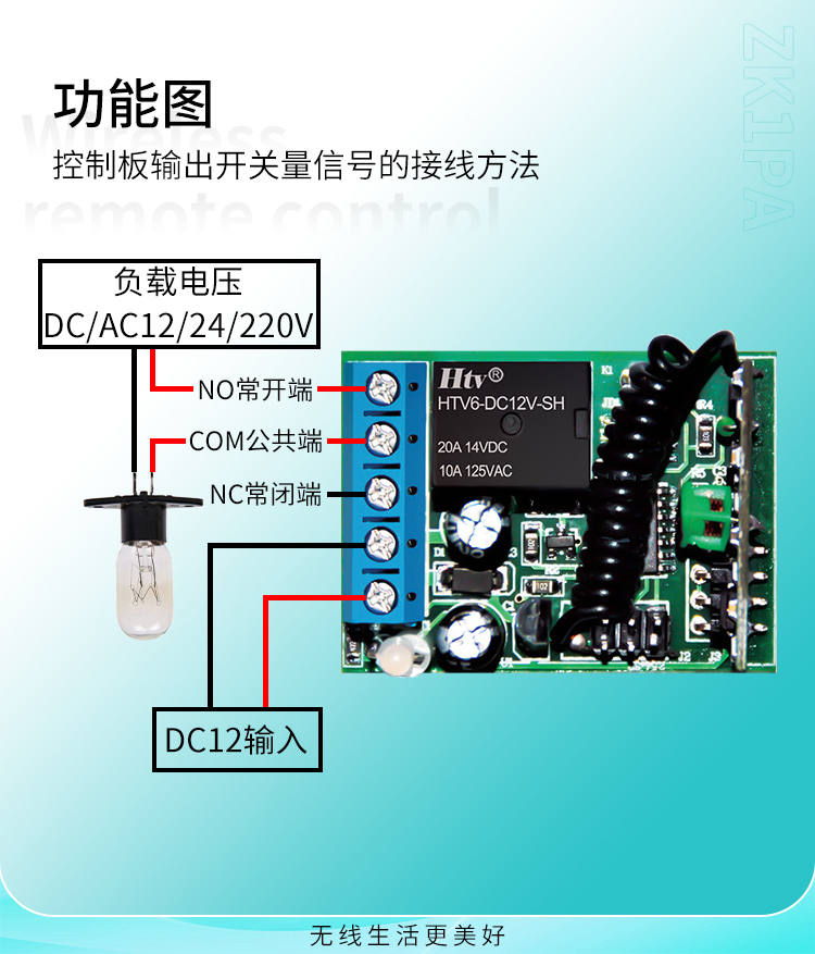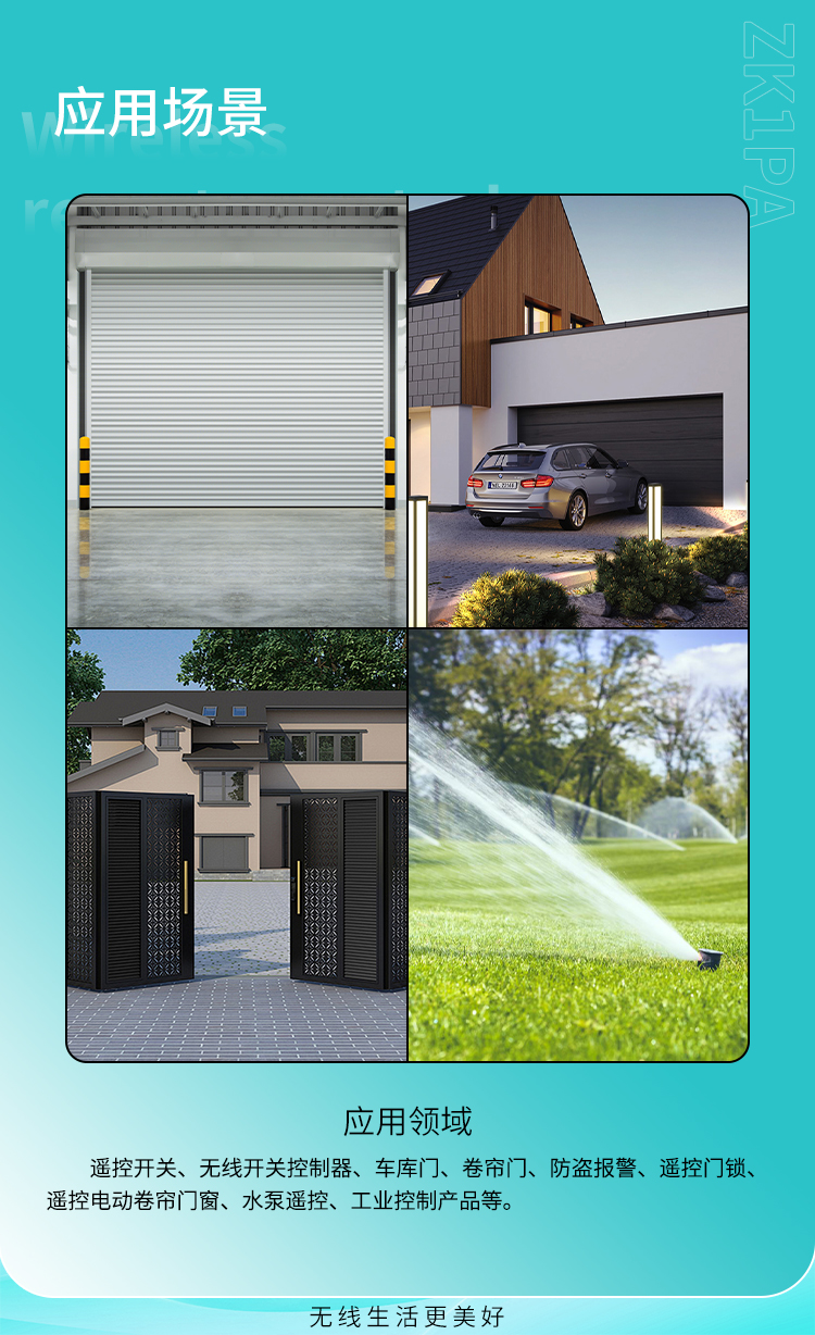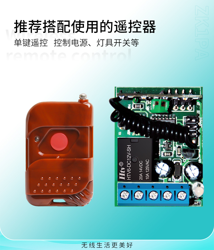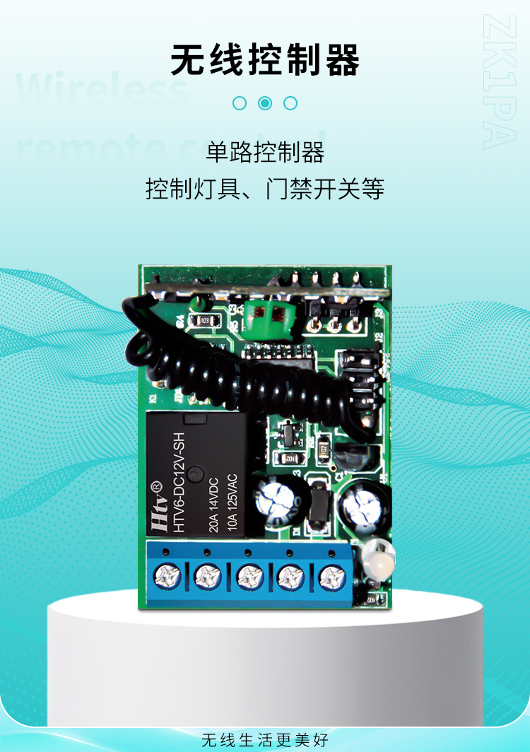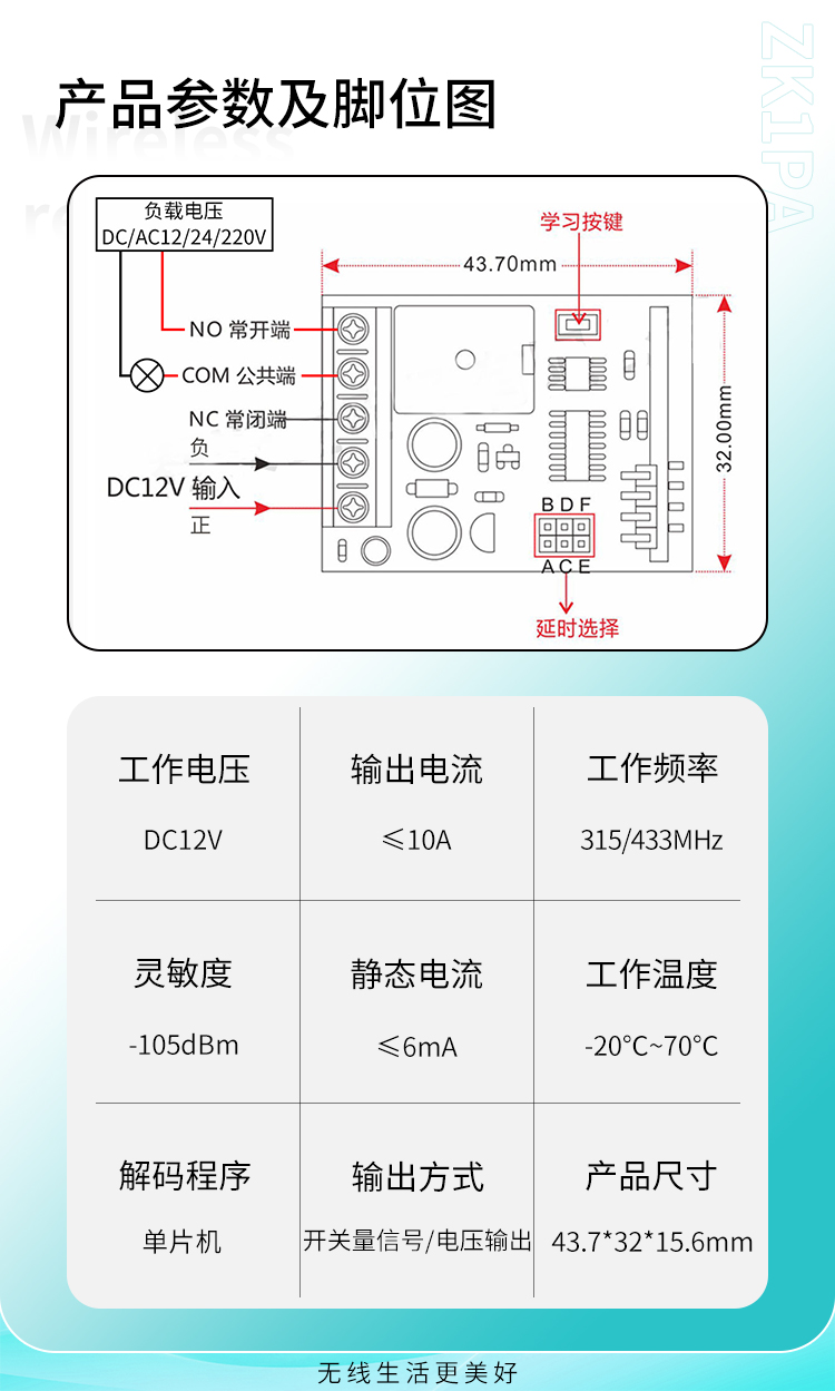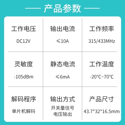 体积小,可延时,接线容易,使用广泛,学习简单,可独立配套,性能稳定,控制门禁,外形好看,性价比高,工作模式可选择,有电源指示,接收灵敏度高。