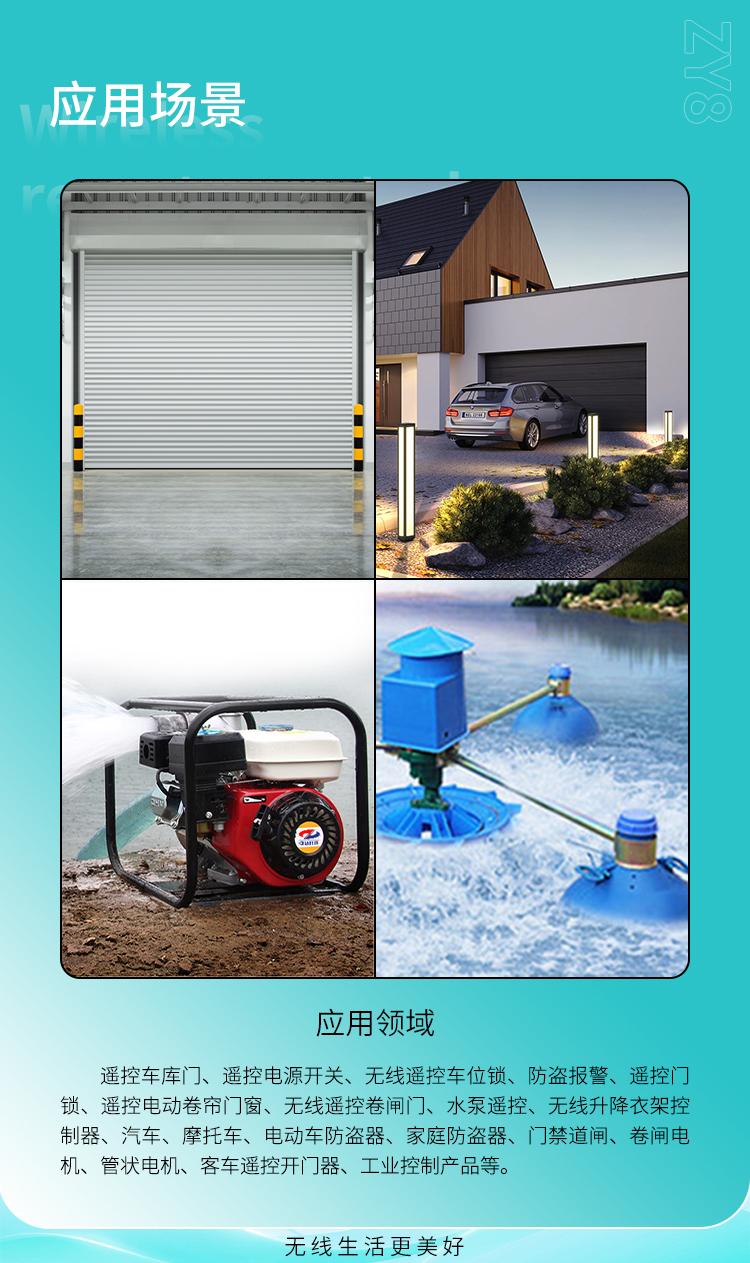 遥控开关、遥控车库门、防盗报警、遥控门锁、遥控电动卷帘门窗、水泵遥控、工业控制产品等;