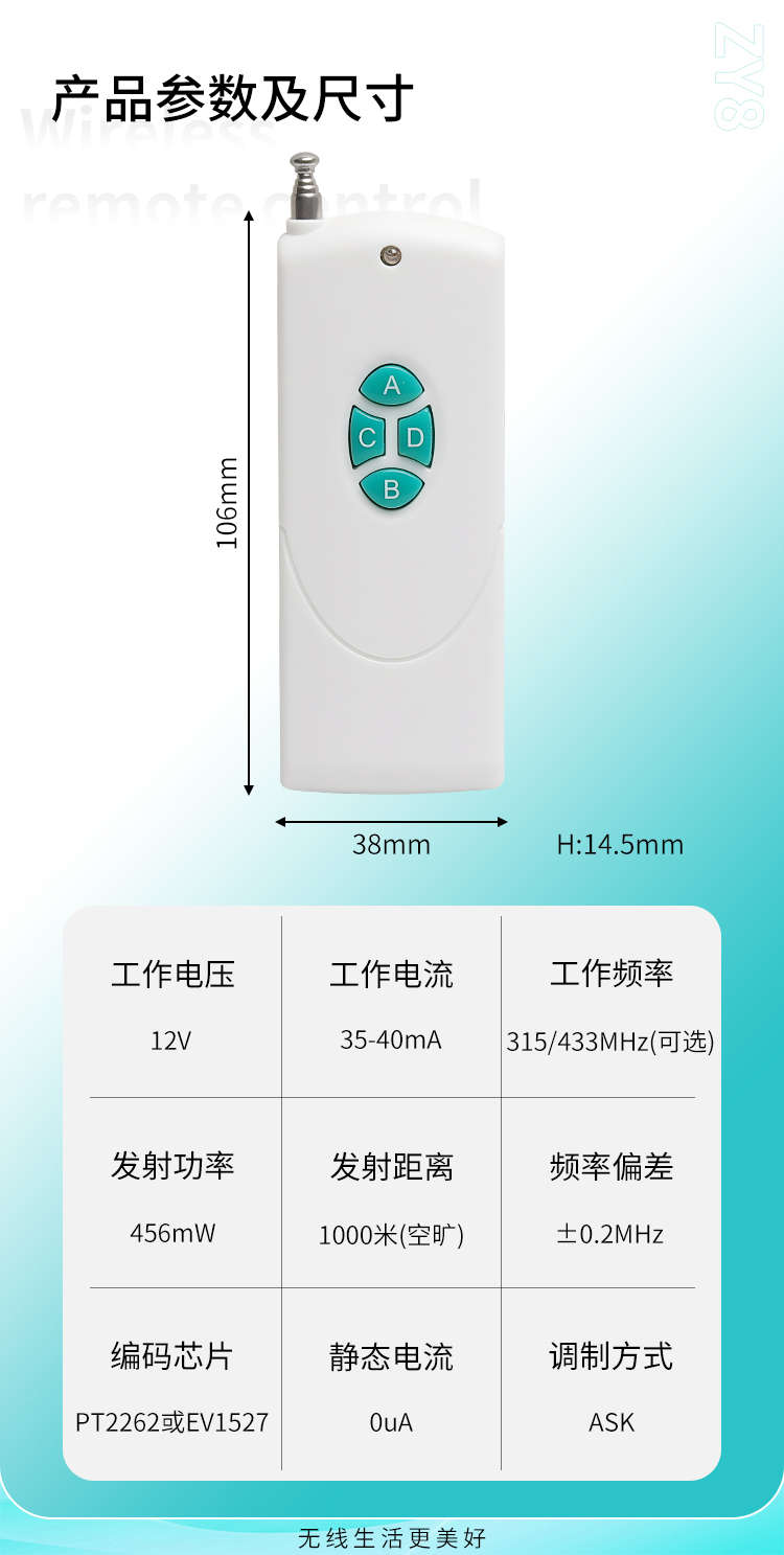 ZY8是一款中功率香妃直播软件下载遥控器,1键4键可选,具有可靠性高、频率稳定、穿透能力强等特点;